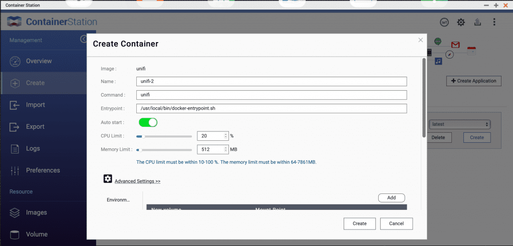 Configure the jacobalberty/unifi image within Container Station